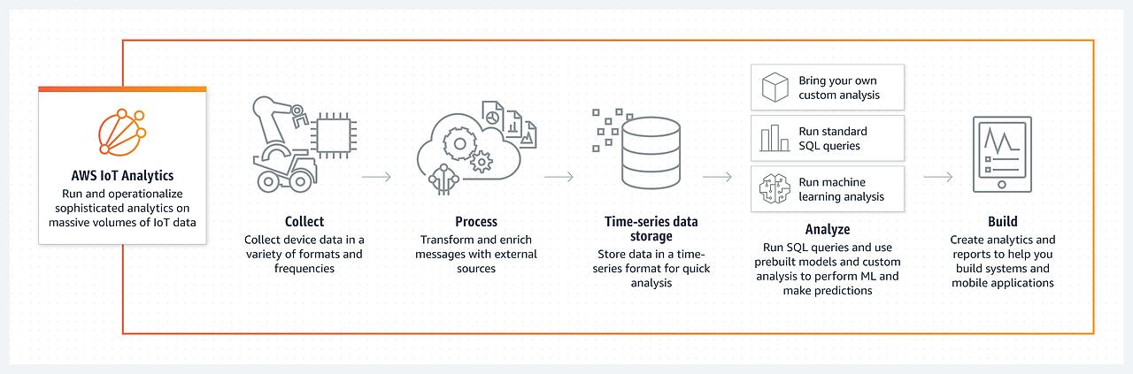 AWS IoT Analytics는 IoT 분석 플랫폼을 구축하는 데 드는 비용과 복잡성 없이 대용량의 IoT 데이터를 분석하는 데 필요한 어려운 단계를 간소화합니다.