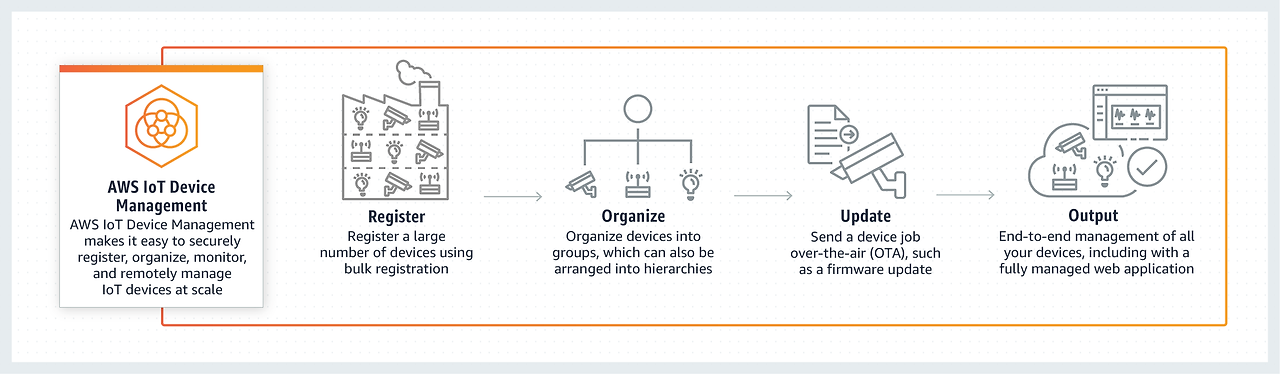 모든 IoT 디바이스를 대량 등록하고 그룹으로 구성하며 무선으로 업데이트하고 쉽게 모니터링합니다.